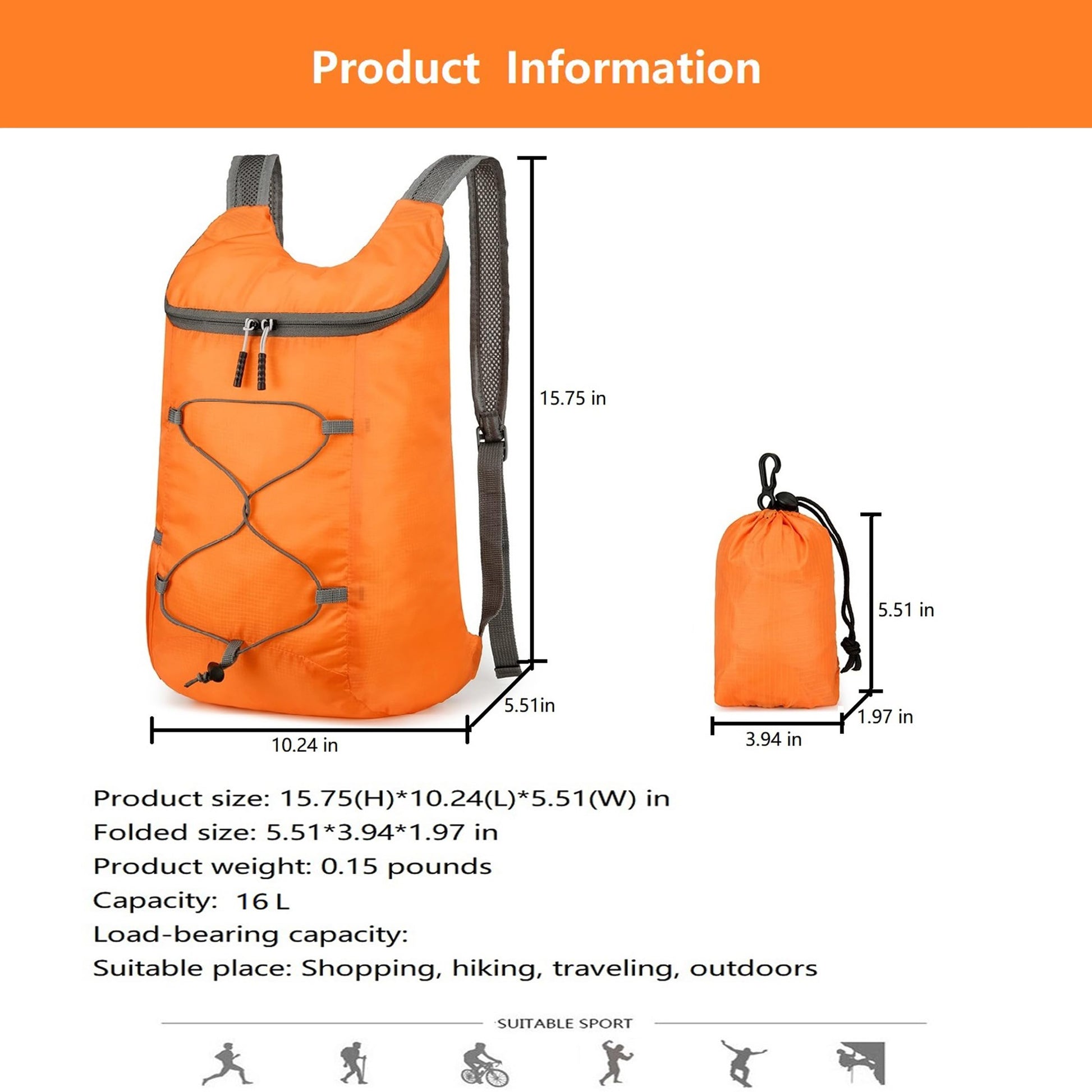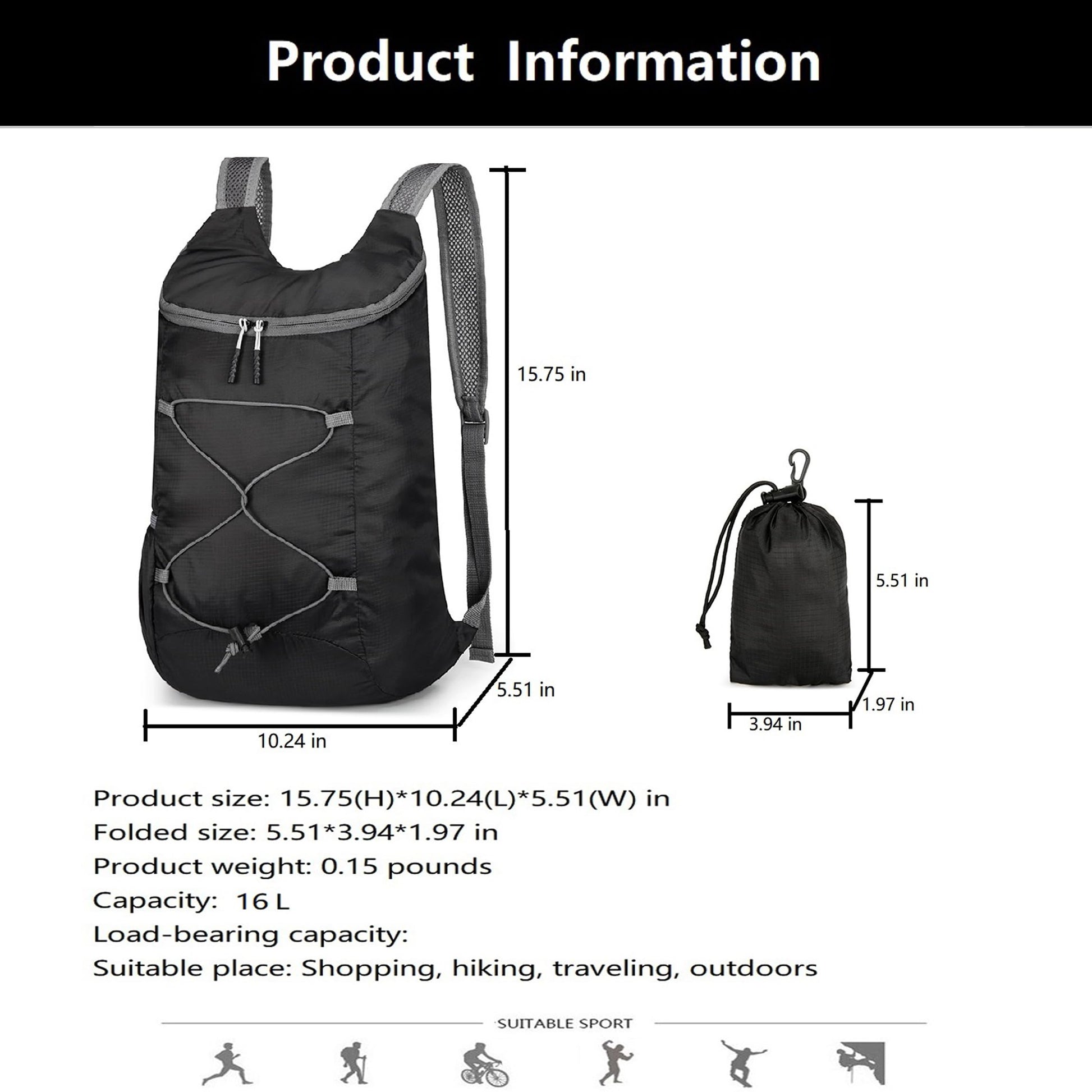 - LIGHTWEIGHT &16 L CAPACITY:The lightweight hiking daypack weighs only 2.82 ounces.unfold size: 10.23 (L) * 15.75(H)*5.51(W)inches,after folding size: 3.94(L)*5.51(H)*1.97(W)inches,the bag folds to the size of a sandwich and fits in a pocket.The main pocket to carry what you need,side pockets for water bottles or umbrella.