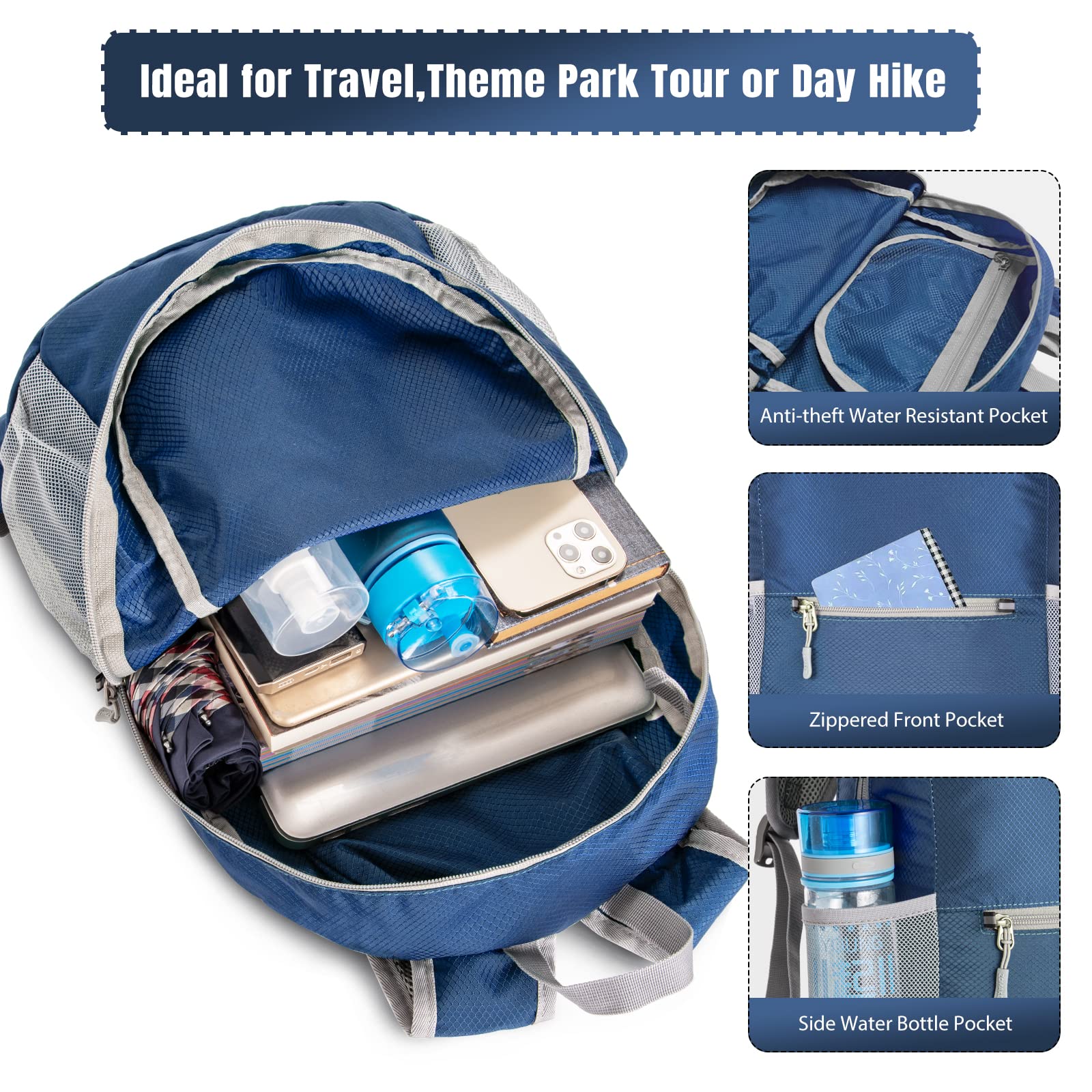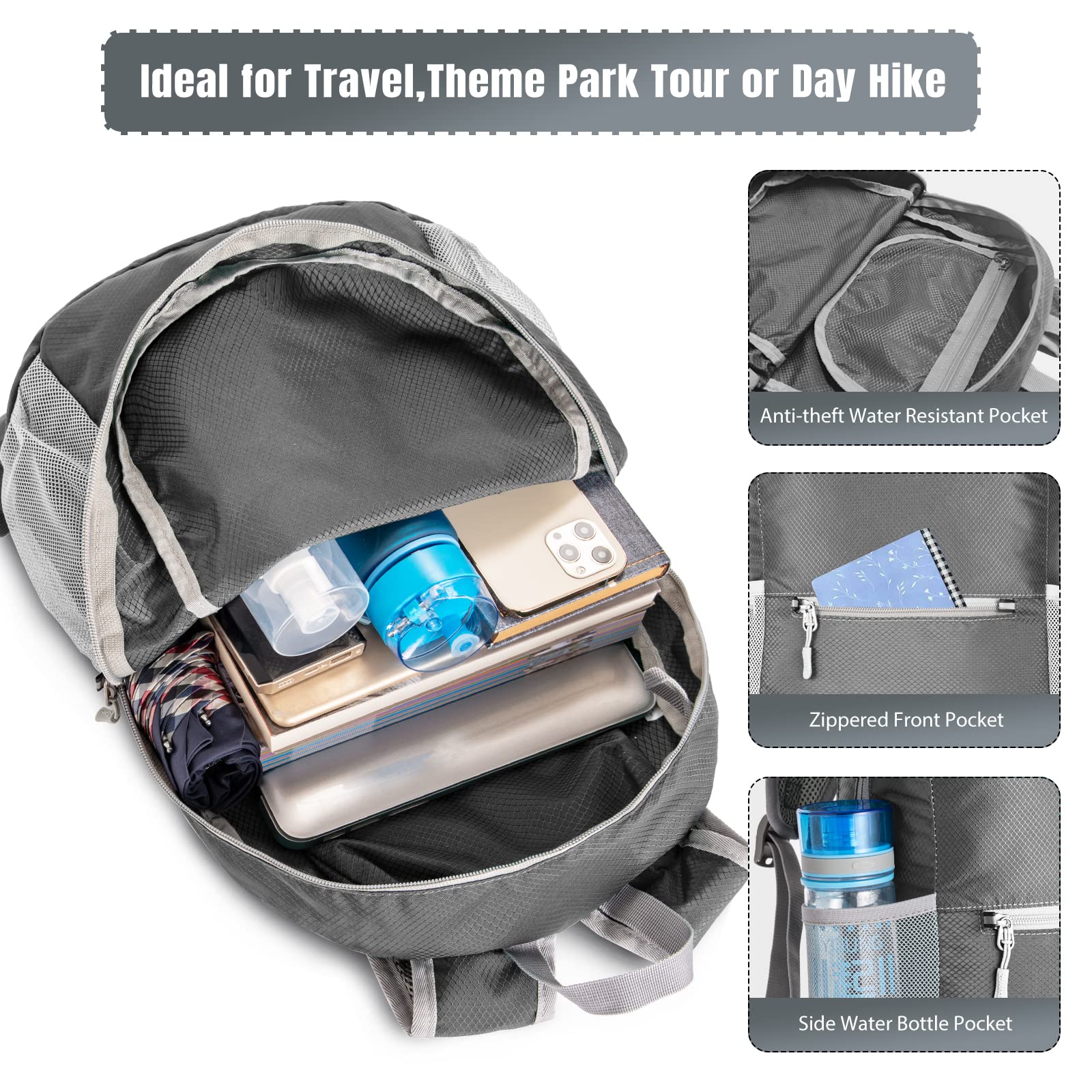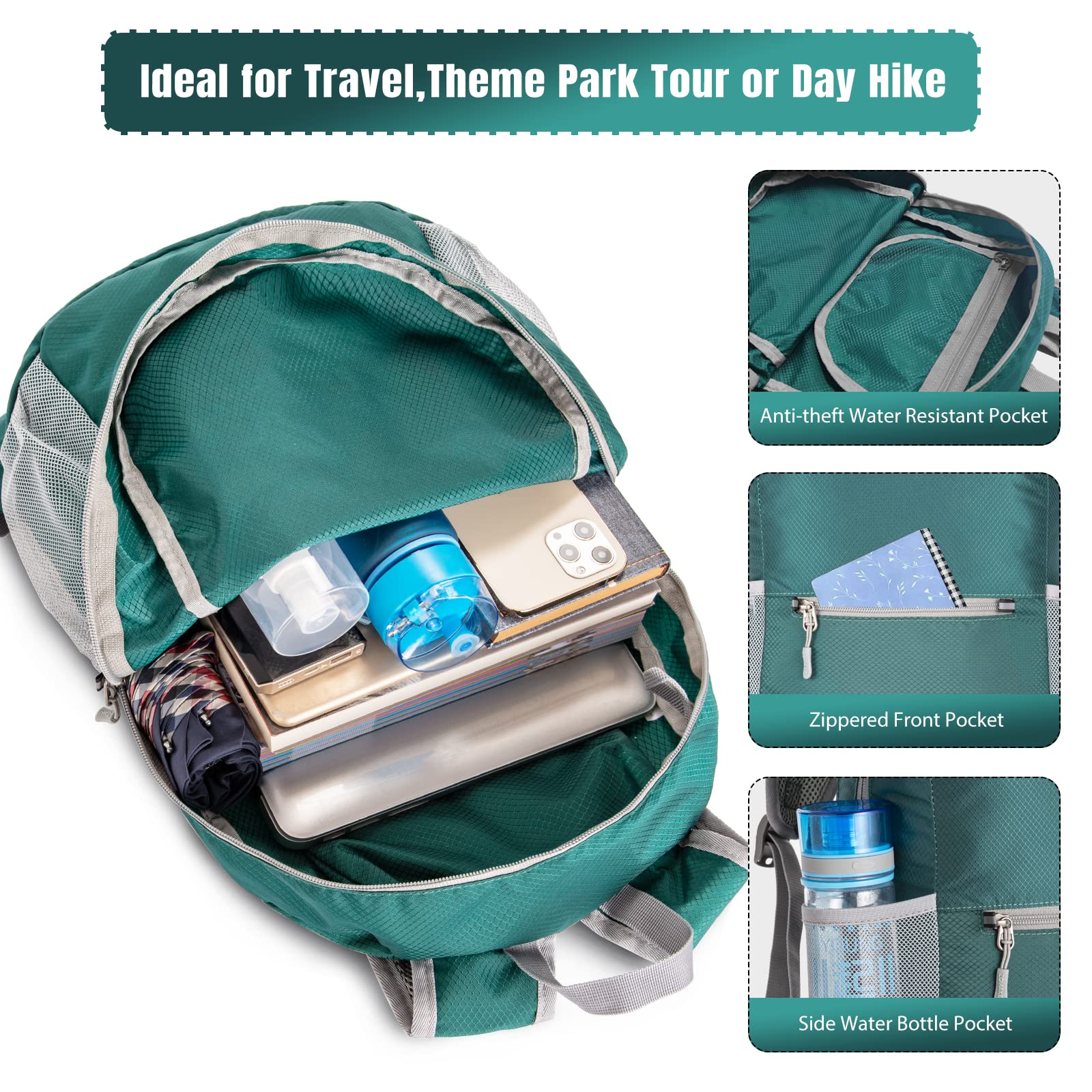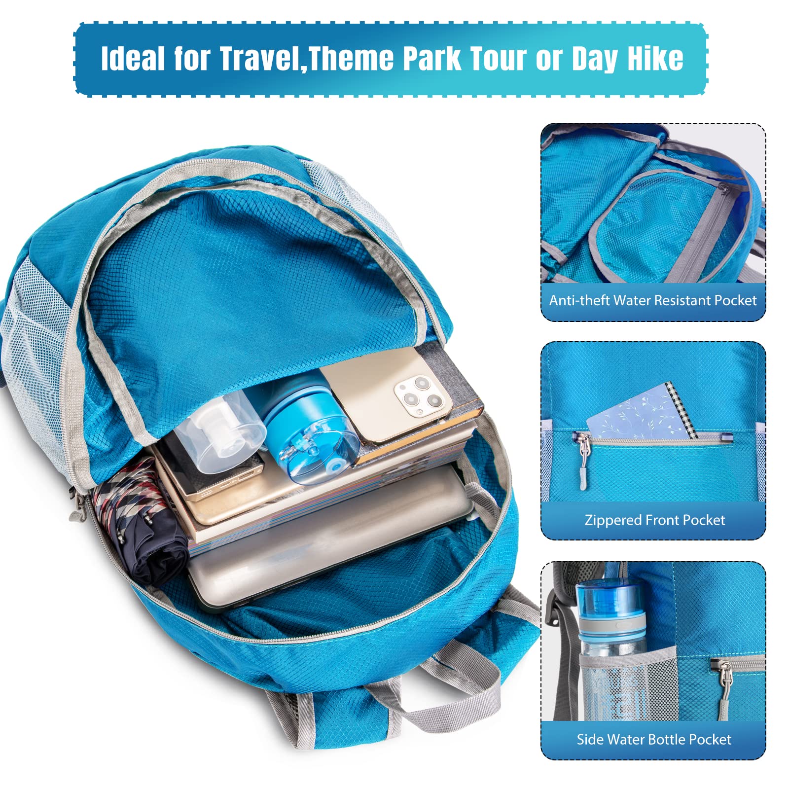 - 20L ULTRA LIGHTWEIGHT FOLDABLE BACKPACK: Our packable hiking backpack water resistant capacity is 20L,the pocket distribution is reasonable,and items are stored in an orderly manner.The main bag is stored clothings,and tourist guidelines in inner partitions.One front bag stores small equipment such as mobile phones,mobile power supply,and two side bags store umbrellas,water bottles or sunglasses.Our small foldable backpack meets the needs of carrying lightweight items
