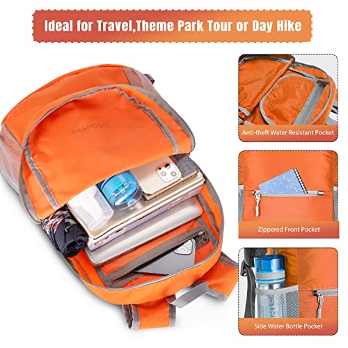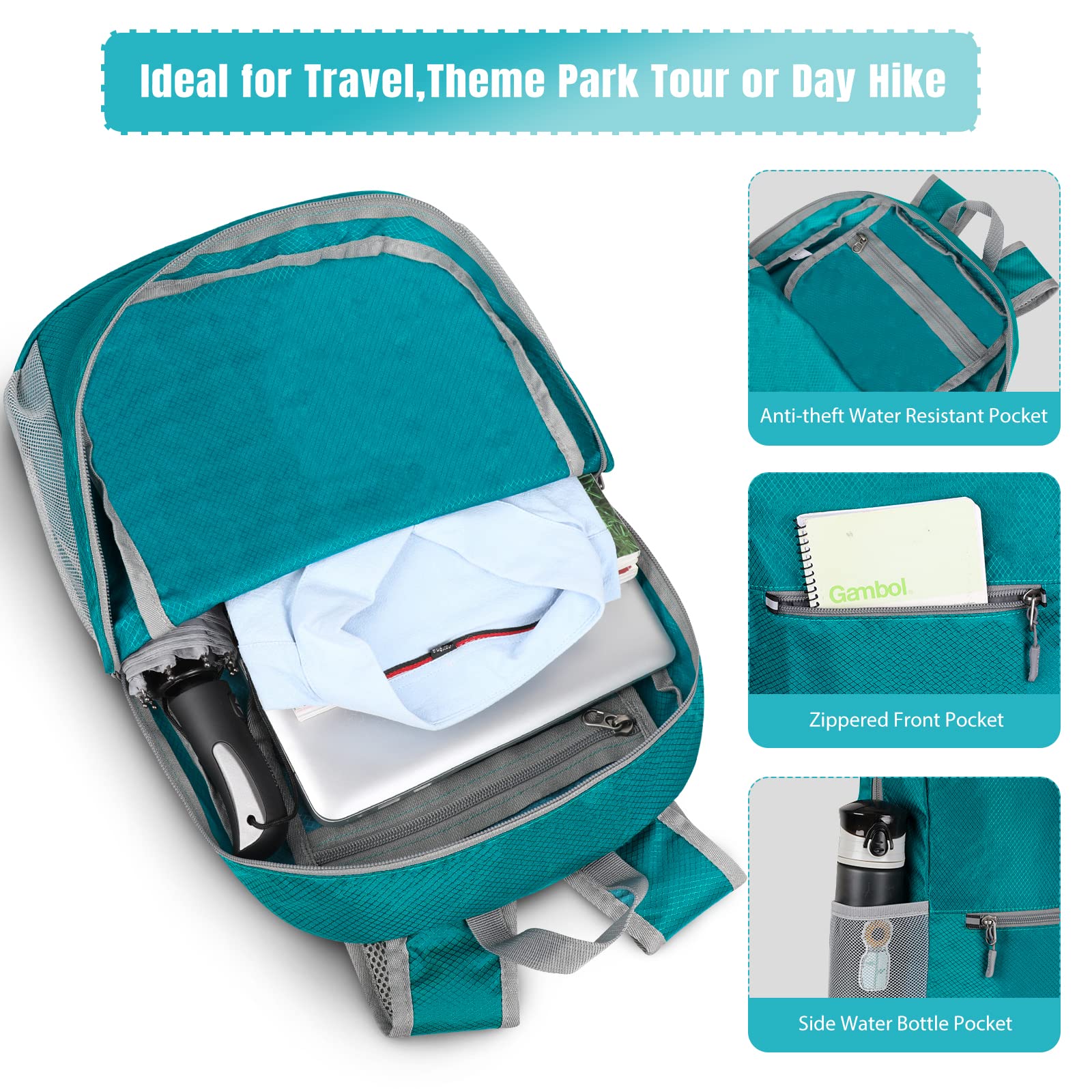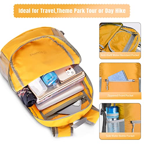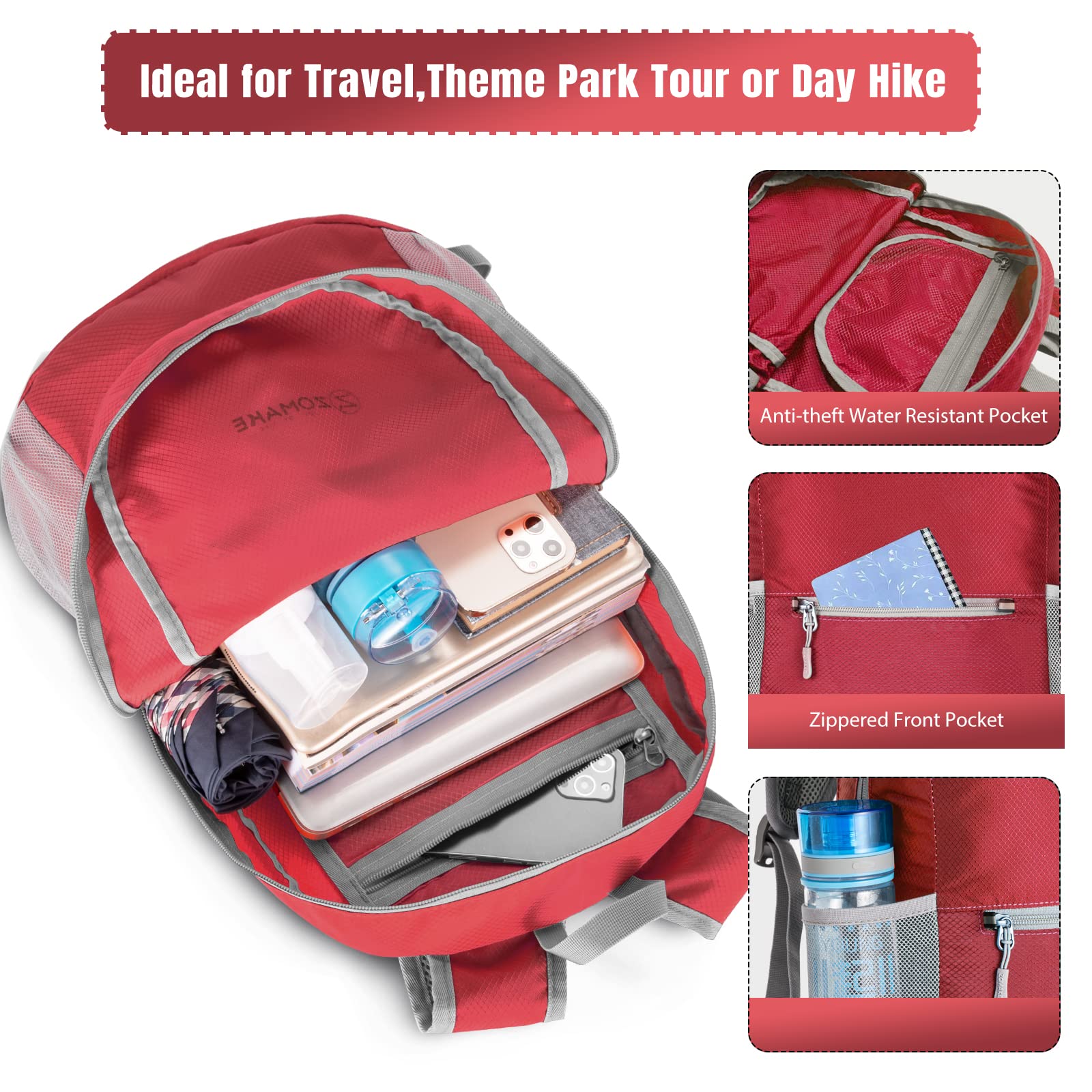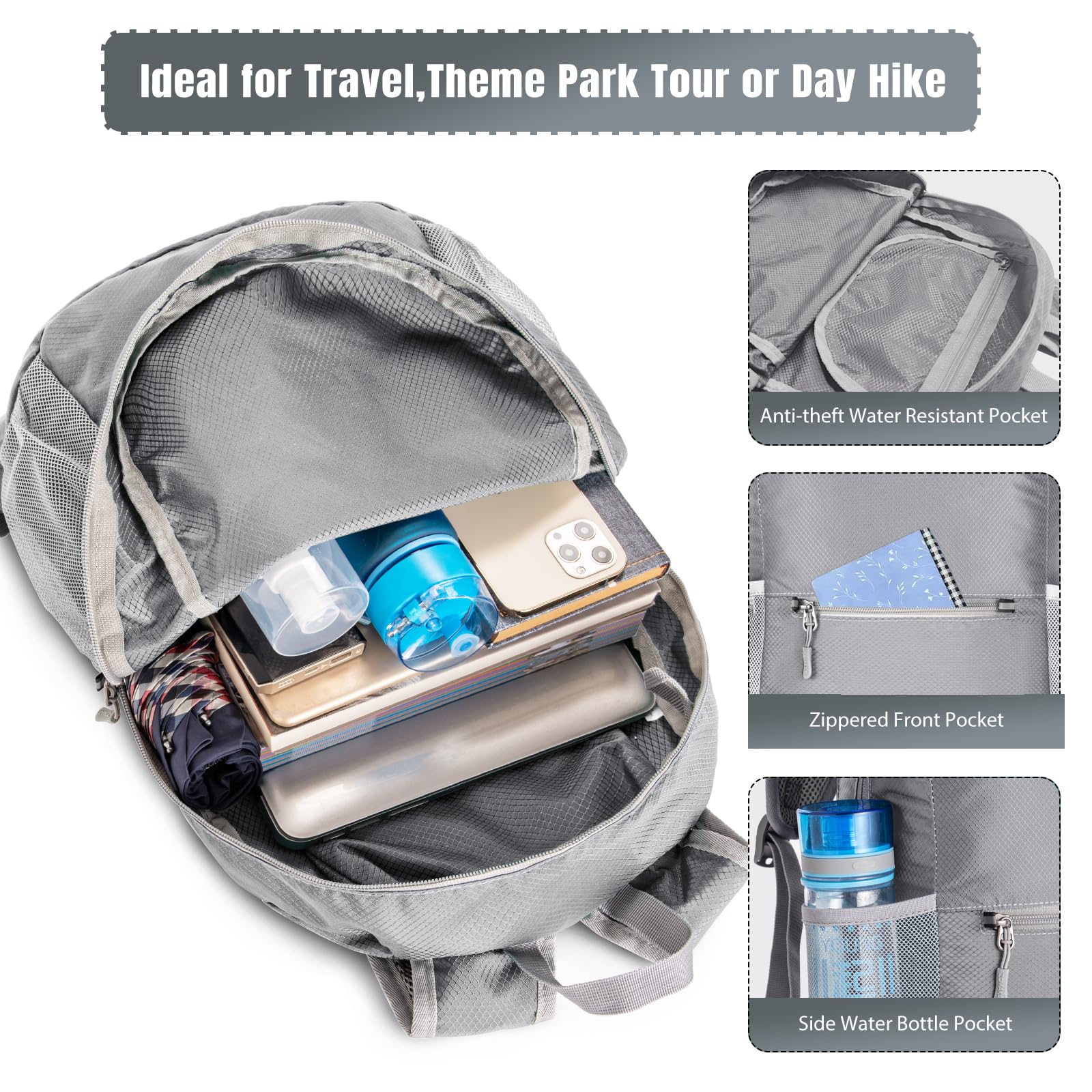 - 20L ULTRA LIGHTWEIGHT FOLDABLE BACKPACK: Our packable hiking backpack water resistant capacity is 20L,the pocket distribution is reasonable,and items are stored in an orderly manner.The main bag is stored clothings,and tourist guidelines in inner partitions.One front bag stores small equipment such as mobile phones,mobile power supply,and two side bags store umbrellas,water bottles or sunglasses.Our small foldable backpack meets the needs of carrying lightweight items